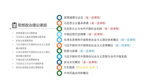 课部开设有“思想道德修养与法治”“马克思主义基本原理”“形势与政策”“中国近现代史纲要”“习近平新时代中国特色社会主义思想概论”“毛泽东思想和中国特色社会主义理论体系概论” 六门理论必修课和“马克思主义与当代中国社会实践”“习近平新时代中国特色社会主义思想与当代中国实践(寒假社会实践)”两门实践必修课,以及“武当文化概论” “汽车强国”“中华民族共同体概论”三门特色思政选修课,含省一流课程5门,校一流课程3门,形成必修课加选修课、理论课加实践课的思政课程体系。