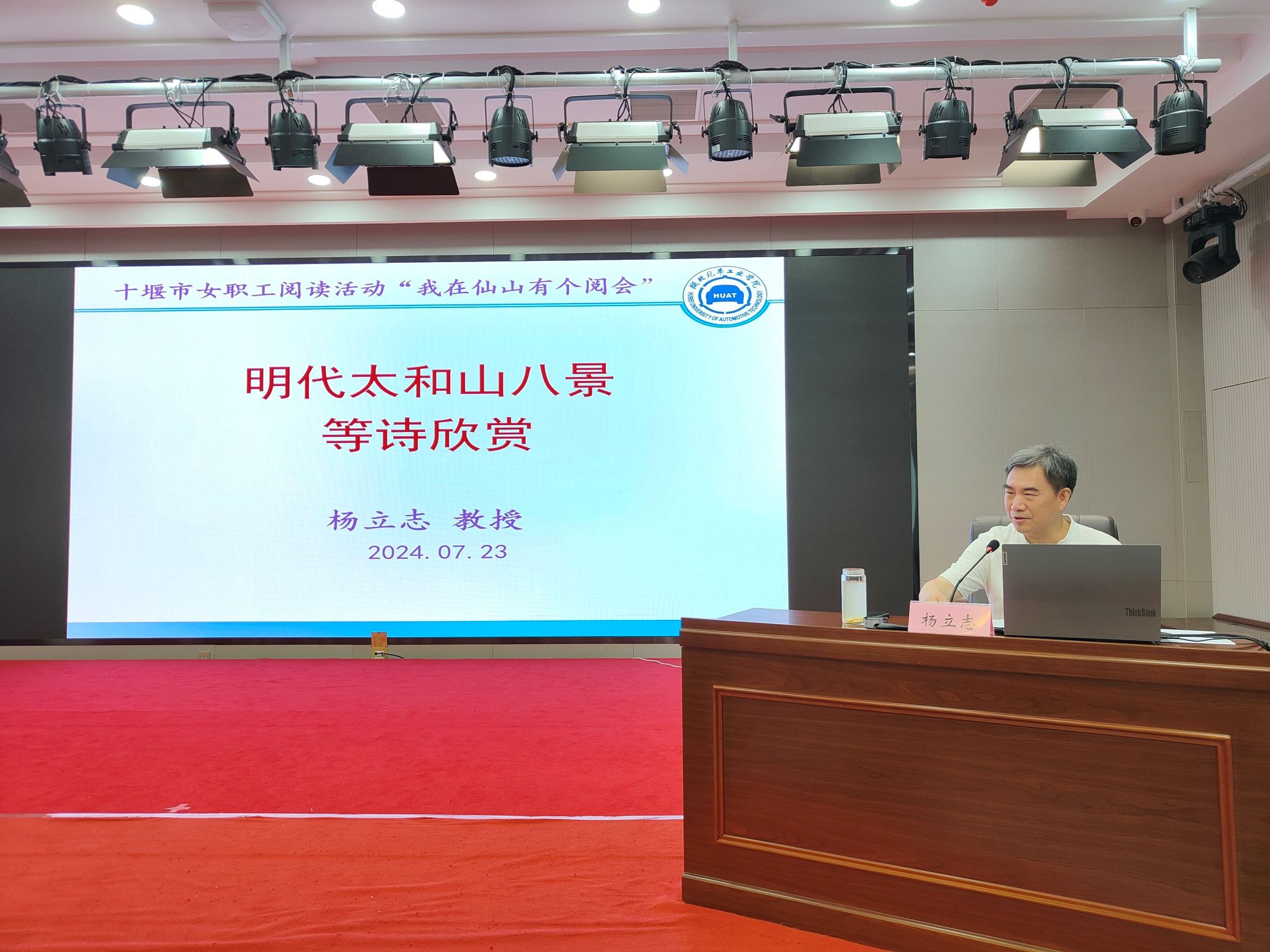 2024年7月23日,“玫瑰书香 阅美十堰”女职工主题阅读示范活动在十堰市工人文化宫举行,开元集团官网人文学院教授、湖北省人文社科重点研究基地武当文化研究与传播中心主任杨立志老师受十堰市总工会与KY开元集团官网校工会邀请,做题为《明代太和山八景等诗欣赏》的讲座。该活动由十堰市总工会女职工委员会主办,十堰市总工会党组书记、常务副主席凌燕,市总工会党组成员、副主席吴海燕,市总工会党组成员、副主席杨东芳等出席活动。