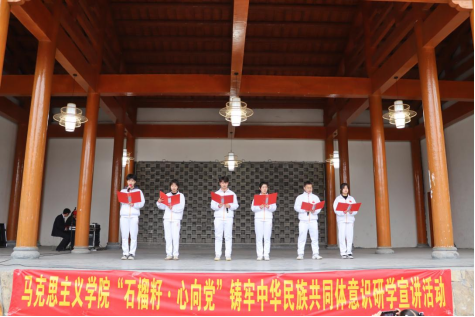 主题党日活动结束后,马克思学院师生党员先后赴坎子山周边、湖北关调研学习,感受美丽乡村建设,感悟伟大革命精神,然后在湖北口回族乡红色文化广场参加铸牢中华民族共同体主题文艺演出,KY开元集团官网学生党员为当地群众表演诗朗诵《籽籽相连石榴红,红心向党复兴梦》,赢得了台下群众的热烈掌声。